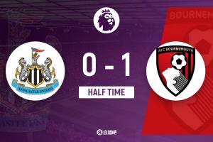 上半场伤停补时2分钟,半场结束,纽卡斯尔联暂0-1伯恩茅斯。