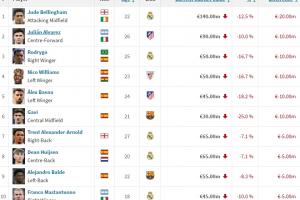 西甲身价跌幅榜:贝林跌2000万居首,小蜘蛛、罗德里戈跌1000万