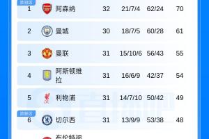 体育资讯04月11日讯 英超第32轮结束一场较量,阿森纳主场1-2负于伯恩茅斯,多赛两场对曼城的领先优势仍为9分,完整英超积分榜如下。