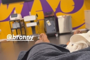 詹姆斯晒出他和儿子布朗尼都早早(洛杉矶时间早上8点40点左右)来到湖人训练馆的理疗师接受理疗并准备参加训练的自拍画面,并写道:“早起的鸟儿🐦有虫🪱吃!@布朗尼”
